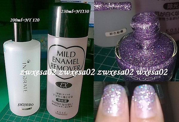重點來了~PR070精品酒店的紫色亮片非常美,顏色正翻天~但是很難卸!!因為我都會刷上三層左右上顏色漸層較明顯,....所以在選擇卸量片專用的去光水時我特別做了一下功課:P
