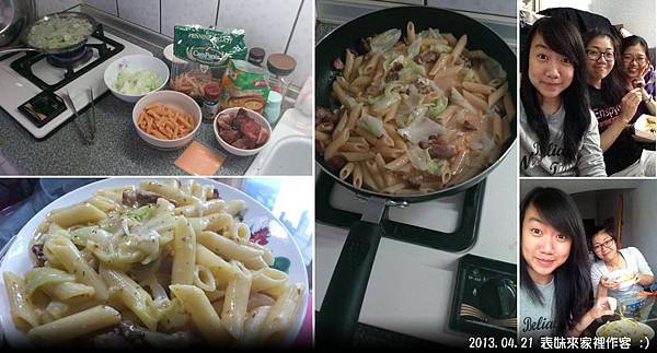 順序:[煮鍋]川燙青菜>燙熟斜管麵>煮醬料>把肉加熱>[換鍋子]>將醬料和麵加入混合>加入香料拌勻>完成!